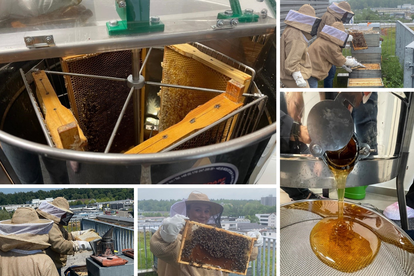Unsere Auszubildenden pflegen sechs Bienenvölker auf dem Dach unseres Firmengebäudes in Friedrichshafen. Von der Pflege der Bienen über das Ernten bis hin zum Abfüllen des Honigs – alles liegt in unseren Händen.